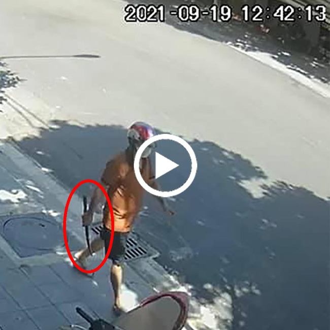 Theo dõi clip có thể thấy, người này đúng với những đặc điểm nghi vấn, đầu đội mũ bảo hiểm, đeo khẩu trang, tay cầm một con dao có cán dài.