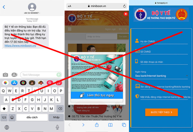 Cụ thể, khi truy cập vào đường link, website sẽ hiển thị thông báo đề nghị người dùng bấm vào để làm thủ tục để nhận trợ cấp. Tuy nhiên sau đó, người dùng được điều hướng đến website honapply.vn yêu cầu nhập họ tên, số CMND, số điện thoại, cùng tên đăng nhập và mật khẩu tài khoản ngân hàng.