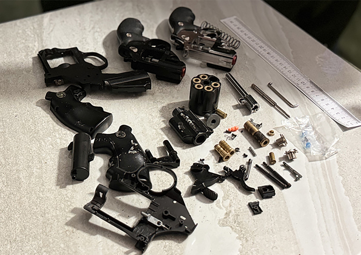 Ngay sau đó, lực lượng chức năng tiến hành khám xét nơi ở của Sang, phát hiện thu giữ 8 cây dao tự chế, 4 khẩu súng các loại, 1 túi ni lông bên trong chứa tinh thể màu trắng nghi là ma tuý và nhiều dụng cụ dùng để sử dụng ma tuý…