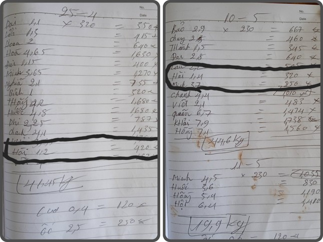 Ông Trương Văn Huân, làm nghề thu mua hải sản tại xã Tân Lập, huyện Đầm Hà căn cứ vào sổ thu mua hải sản khẳng định: Ngày 25/4/2023 và ngày 10/5/2023, ông Hài vẫn đi đánh cá, có nhập hải sản tươi sống cho ông. Đó chính là hai ngày mà biên bản hỏi cung Cường với chữ ký của ông Hài được lập tại công an TP Thái Nguyên.