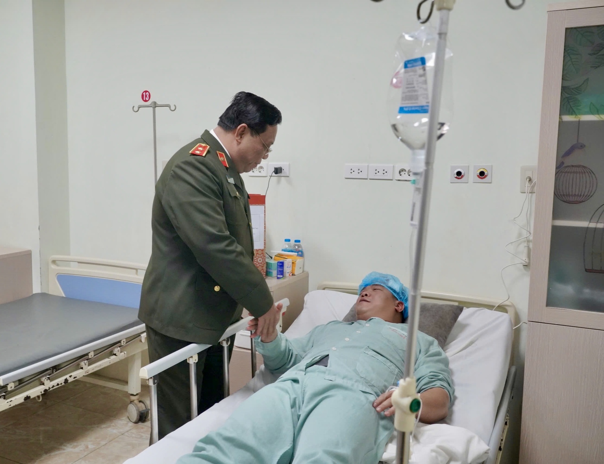 Tại đây, Trung tướng Nguyễn Hải Trung cùng các chỉ huy đơn vị đã ân cần hỏi thăm sức khoẻ Thiếu tá Nguyễn Anh Tuấn. Ông Trung ghi nhận, biểu dương tinh thần trách nhiệm của Thiếu tá Nguyễn Anh Tuấn, đã không ngại khó khăn, nguy hiểm, hoàn thành tốt nhiệm vụ được giao. Đồng chí Giám đốc mong rằng Thiếu tá Nguyễn Anh Tuấn sẽ sớm hồi phục sức khoẻ để sớm trở lại với công việc, góp phần bảo vệ an ninh trật tự Thủ đô, giữ vững cuộc sống bình yên của nhân dân.