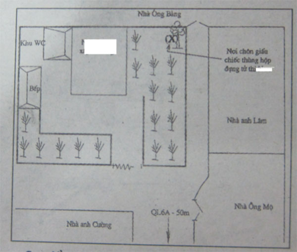 Đào khỏi mặt đất chừng 10cm, đoàn khám nghiệm phát hiện một lớp gạch kết dính bằng xi-măng; tiếp tục đào sâu thêm khoảng 0,9m nữa thì lộ ra chiếc thùng hình chữ nhật (kích thước 0,47m x 0,67m). Bên ngoài chiếc thùng được bao kín bởi nhiều tấm bạt nhựa màu xanh, kết dính với các lớp băng keo dán ngang màu vàng; ở giữa có một dây dù được buộc theo kiểu kiện hàng.