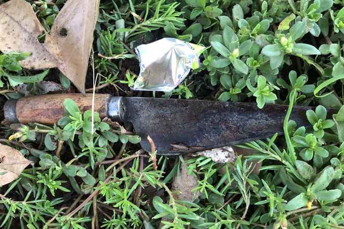 Vào cuộc điều tra, cảnh sát phát hiện cạnh đường bêtông cách nhà nạn nhân khoảng 30 m có con dao bầu (dạng dao phóng heo) dài 29 cm, còn dính máu. Camera an ninh nhà nạn nhân ghi hình kẻ giết người có dáng cao, gày, mặc quần jean, áo khoác, đội mũ trùm đầu. Hình ảnh rất mờ, nhòe, khó nhận dạng; chỉ xác định hung thủ cầm vật giống con dao bằng tay trái.