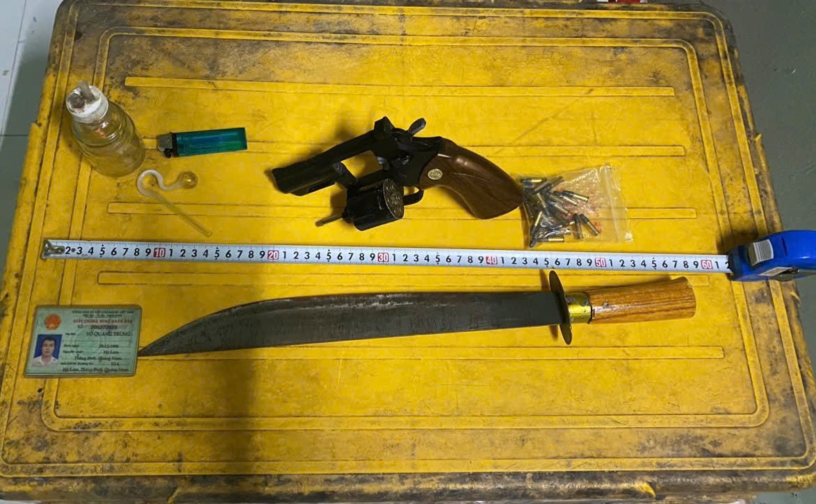 Ngoài ra, bên trong túi áo ấm của Trung để trong phòng ngủ có 1 khẩu súng ngắn (dạng rulo) bằng kim loại, trong ổ đạn xoay có 6 viên đạn, 1 túi ni-lông bên trong chứa 22 viên đạn và 1 dao tự chế. Tiến hành test nhanh, kết quả đối tượng Trung dương tính với ma tuý.