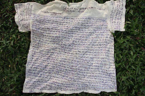 | Những dòng chữ kêu oan ghi chi chít trên áo của tử tù Mạnh. |