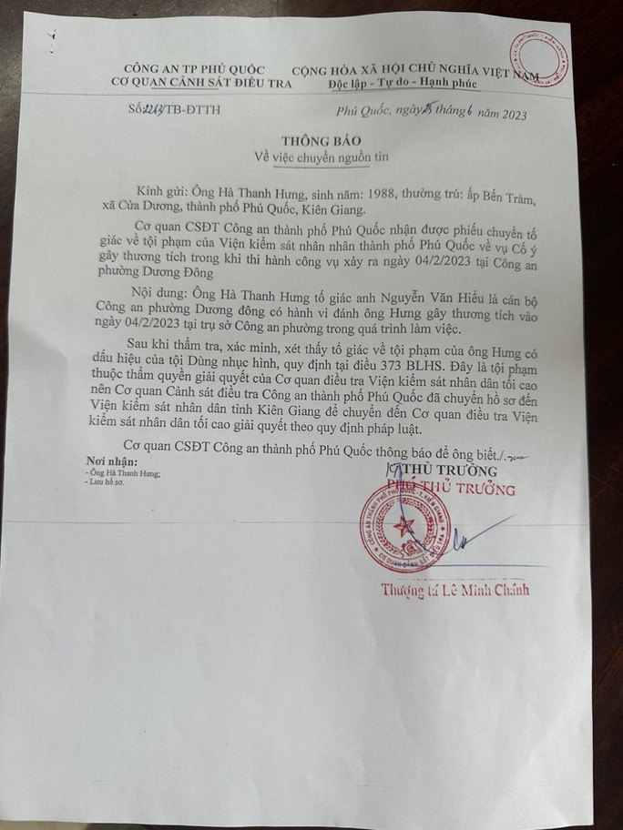 Ngày 27-6, Công an TP Phú Quốc, tỉnh Kiên Giang đã tống đạt thông báo về việc chuyển nguồn tin tố giác tội phạm cho gia đình bị hại là ông Hà Thanh Hưng (SN 1988, ngụ phường Dương Đông, TP Phú Quốc).