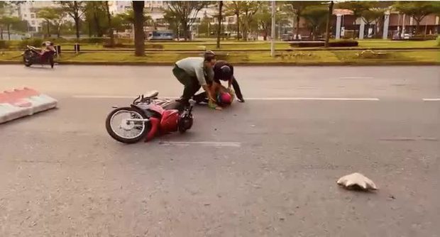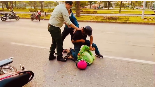 Lúc này, 2 tên cướp chạy xe máy với tốc độ cao liều mình cho xe tông vào hàng rào để thoát nhưng bị ngã văng khoảng 5m. Hai đối tượng bò dậy định chạy thì bị tổ bảo vệ phối hợp với người đi đường khống chế.