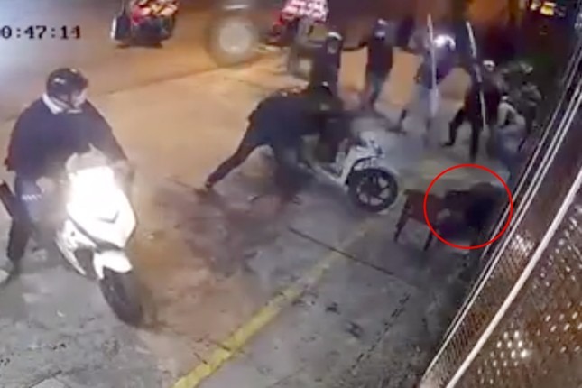 Hình ảnh từ camera an ninh cũng cho thấy nhóm cầm chĩa đâm liên tục vào người của nhóm anh L.. Sau khi tấn công, những người này rời đi.
