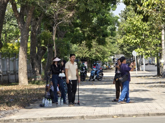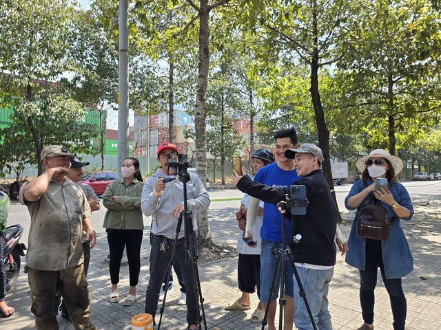 Tại cổng tòa, hàng chục Youtuber, TikToker đứng livestream từ trưa. Những người này đứng bên ngoài cổng tòa và livestream rất rôm rả.