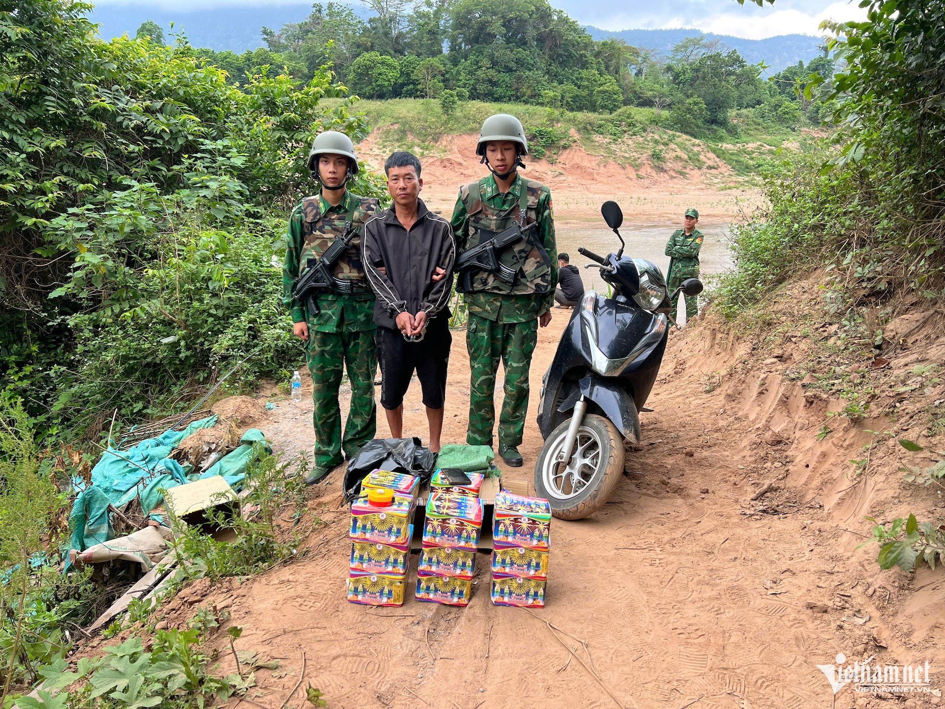 Trước đó, vào khoảng 6h ngày 26/4, tại tuyến đường đất dẫn xuống sông Sê Pôn thuộc thôn Long Quy, xã Lao Bảo, tổ công tác triển khai nhiệm vụ tuần tra, kiểm soát nhằm ngăn chặn hoạt động buôn bán, vận chuyển pháo trái phép. Trong quá trình làm nhiệm vụ, lực lượng chức năng phát hiện một người đàn ông điều khiển xe máy có dấu hiệu khả nghi.