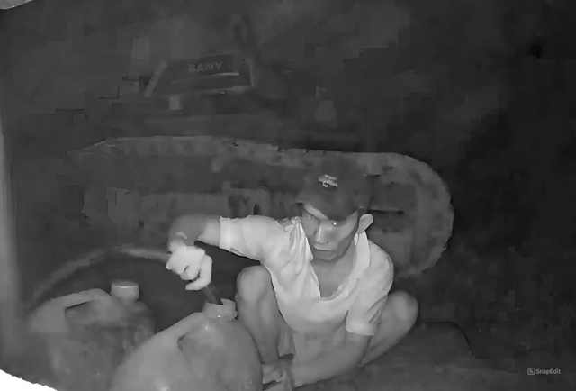 Hình ảnh từ camera giám sát cho thấy, những ngày cuối tháng 9-2024, khung giờ từ 23 giờ đến rạng sáng hôm sau, có 1 người đàn ông dẫn theo 1 con chó liên tục hút trộm dầu của các máy múc. Sau khi hút đầy 2 can (mỗi can khoảng 30 lít) thì người này rời đi và không quên lau dọn dấu vết.