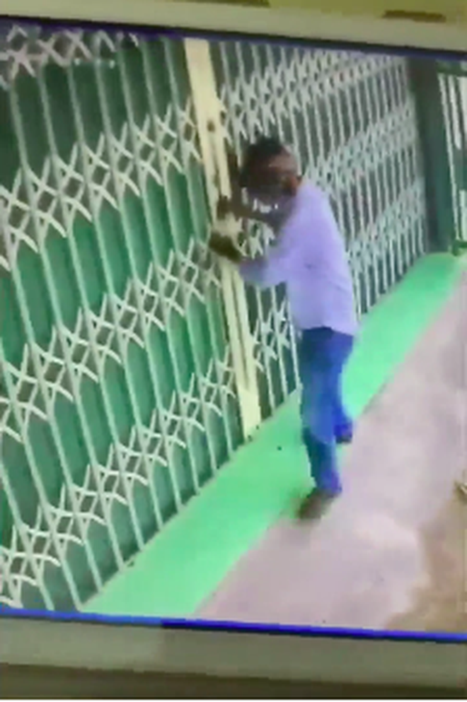 Theo dõi hình ảnh trong đoạn clip cho thấy, một người đàn ông trung niên đội mũ lưỡi trai, đeo khẩu trang đứng trước cửa xếp, dùng công cụ nhanh chóng phá 2 ổ khoá kiên cố bên ngoài cửa. Chỉ bằng thanh sắt và vài cái bẩy nhẹ nhàng chiếc khoá lớn bên ngoài cửa đã bị bật tung.