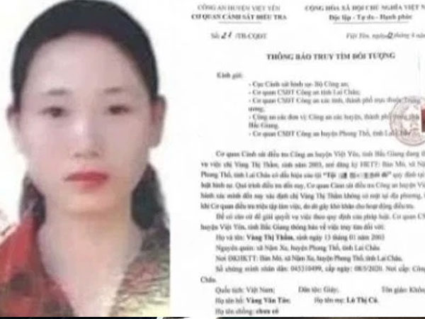 Theo đó, người này là Vàng Thị Thắm, SN 2003, trú huyện Phong Thổ, tỉnh Lai Châu.