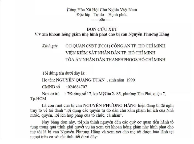 Cụ thể, ông Tuấn làm đơn xin khoan hồng, giảm nhẹ hình phạt cho mẹ mình với lý do từ trước đến nay mẹ mình đã có nhiều đóng góp trong hoạt động từ thiện, nhân đạo, nhất là trong đại dịch Covid-19.
