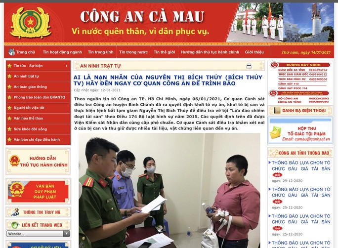 Ngày 14/1, lãnh đạo Công an tỉnh Cà Mau cho biết đang kêu gọi ai là nạn nhân hoặc có thông tin, chứng cứ về hành vi vi phạm của Nguyễn Thị Bích Thủy (Bích Thủy TV) đến ngay cơ quan này để trình báo vụ việc.