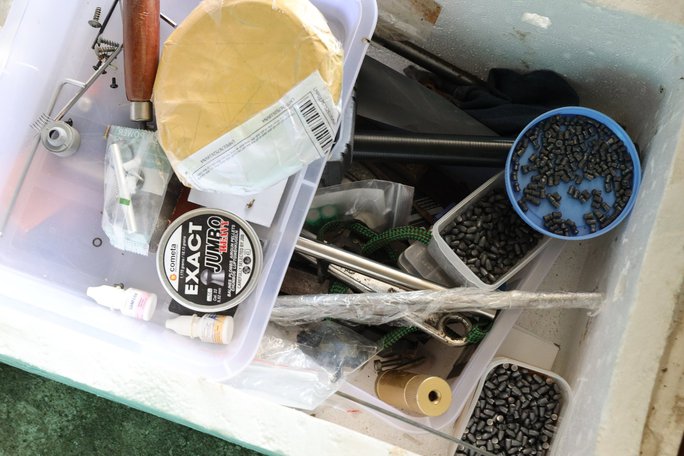 Qua kiểm tra, phát hiện Phạm Thanh Phong (SN 1985) đang tàng trữ nhiều linh kiện súng hơi và súng săn gồm: 1 cây súng hơi tự chế; 1 hộp tiếp đạn; khoảng 1.100 viên đạn các loại; 4 báng súng và nhiều linh kiện, bộ phận của súng hơi tự chế khác nhau...