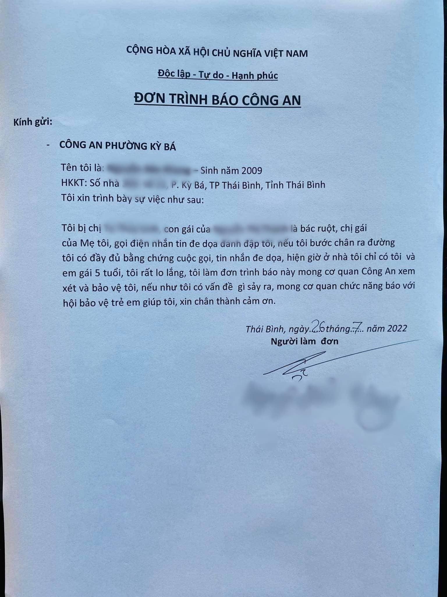 Tài khoản N.B.K. còn tố cáo bị nhiều tin nhắn gửi đến đe dọa, buộc phải làm đơn trình báo đến công an phường Kỳ Bá, TP Thái Bình nhờ bảo vệ. Ngoài bài viết trên trang cá nhân, facebook Đ.B.K cũng đã đưa lên nhiều hình ảnh như đơn tố cáo, ảnh chụp đến cơ quan công an trình báo...để chứng minh sự việc trên.