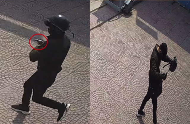 Đặc điểm nhận dạng của tên cướp là một nam thanh niên khoảng 20 đến 25 tuổi, giọng nói miền nam, cao khoảng 1,65 mét, dáng người cân đối, khi gây án đeo khẩu trang màu đen, đội mũ kết màu đen phía trong, mũ bảo hiểm màu xanh lá cây, đeo bao tay vải mặc áo khoác màu xám xanh, quần dài màu đen, đi giày thể thao màu đen có đế màu trắng và đeo một cặp vải màu đen hiệu Samsonite.