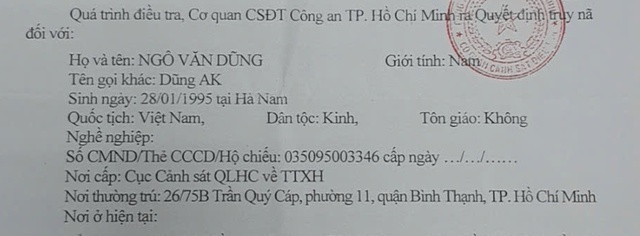 Trong quá trình điều tra, Cơ quan CSĐT Công an TP HCM ra quyết định truy nã Ngô Văn Dũng (còn gọi là Dũng AK, SN 1995, quê tỉnh Hà Nam; thường trú tại 26/75B Trần Quý Cáp, phường 11, quận Bình Thạnh, TP HCM).