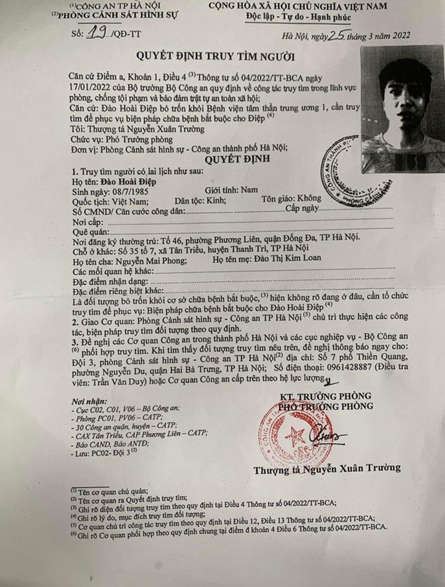 Theo cơ quan công an, Điệp là đối tượng bỏ trốn khỏi cơ sở chữa bệnh bắt buộc, hiện không rõ đang ở đâu, cần truy tìm để phục vụ biện pháp chữa bệnh bắt buộc.