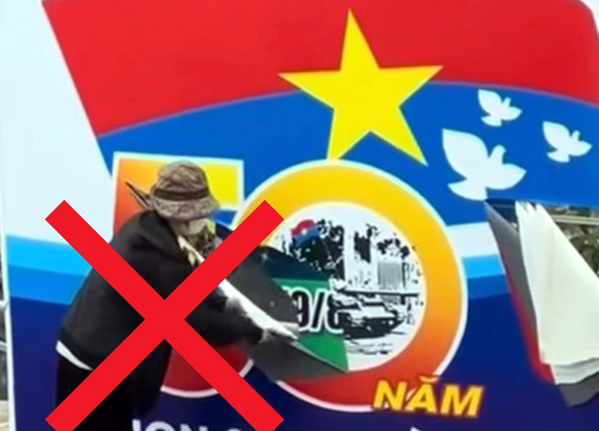 Trước đó, cùng ngày 22/4, trên mạng xã hội xuất hiện đoạn clip ghi lại cảnh một người phụ nữ cầm dao rạch nát tấm pa nô có nội dung chào mừng 50 năm ngày thống nhất đất nước.