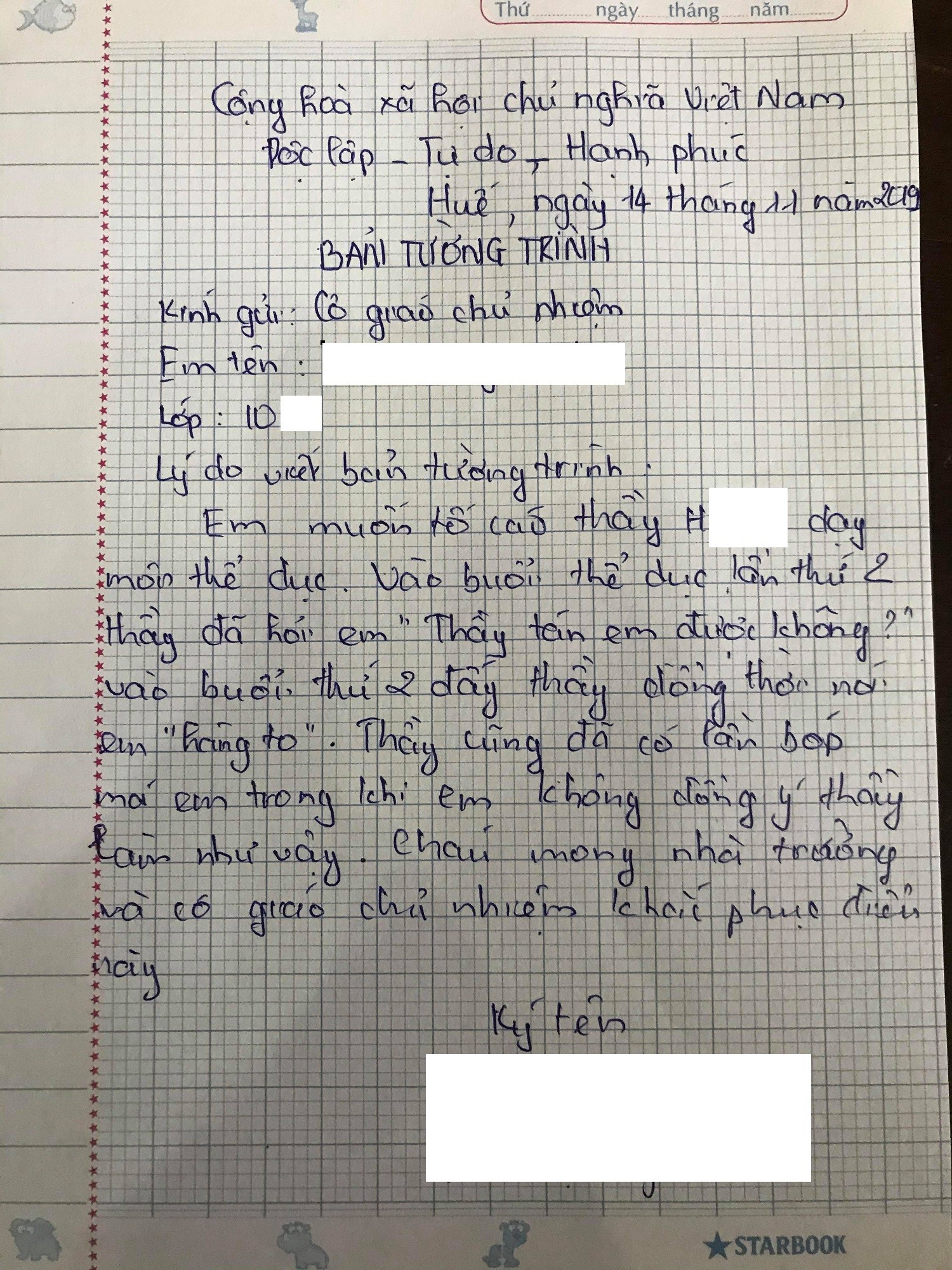 Đến ngày 19/11, gia đình em N. cũng đã viết đơn tố cáo gửi các đơn vị liên quan yêu cầu làm rõ hành vi, lời nói của thầy N.T.H.