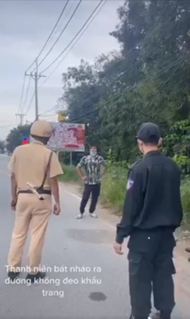 Sau đó, thanh niên còn thách thức "đầy người không có" rồi quay đi. Nhận thấy đối tượng có dấu hiệu khả nghi, cán bộ công an liền hỏi: "Anh đứng lại, tại sao qua chốt kêu xuất trình giấy tờ không có, bảo đeo khẩu trang cũng không đeo".