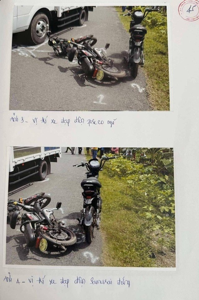 Sau khi tiến hành khám nghiệm hiện trường, ngày 14/9/2024, Đội CSGT - TT Công an huyện Trà Ôn xác định khu vực xảy ra tai nạn là đoạn đường thẳng, mặt đường bê tông trải nhựa, khô ráo, rộng khoảng 5 m. Điểm va chạm giữa hai xe đạp điện nằm cách lề phải theo hướng Vĩnh Xuân đi Hựu Thành khoảng 0,5 m; vị trí nạn nhân bị xe tải cán nằm cách lề phải 2,1 m.