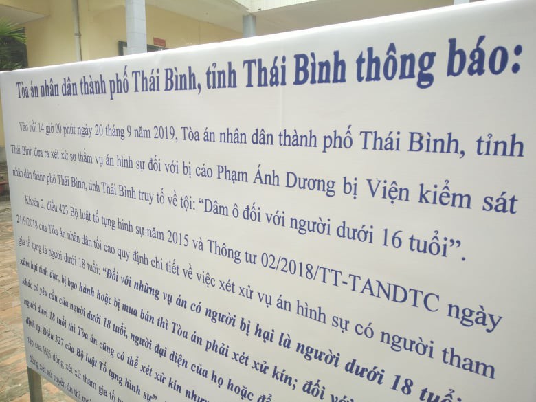 Theo cáo trạng, Phạm Ánh Dương bị gia đình bé gái SN 2008 cùng trú tại phường Đề Thám tố cáo đã có hành vi xâm hại con gái họ. Đến ngày 1/6/2019, Cơ quan CSĐT Công an TP.Thái Bình đã thực hiện lệnh bắt người bị giữ trong trường hợp khẩn cấp và tạm giữ hình sự đối với Phạm Ánh Dương để điều tra về tội danh Dâm ô trẻ em.