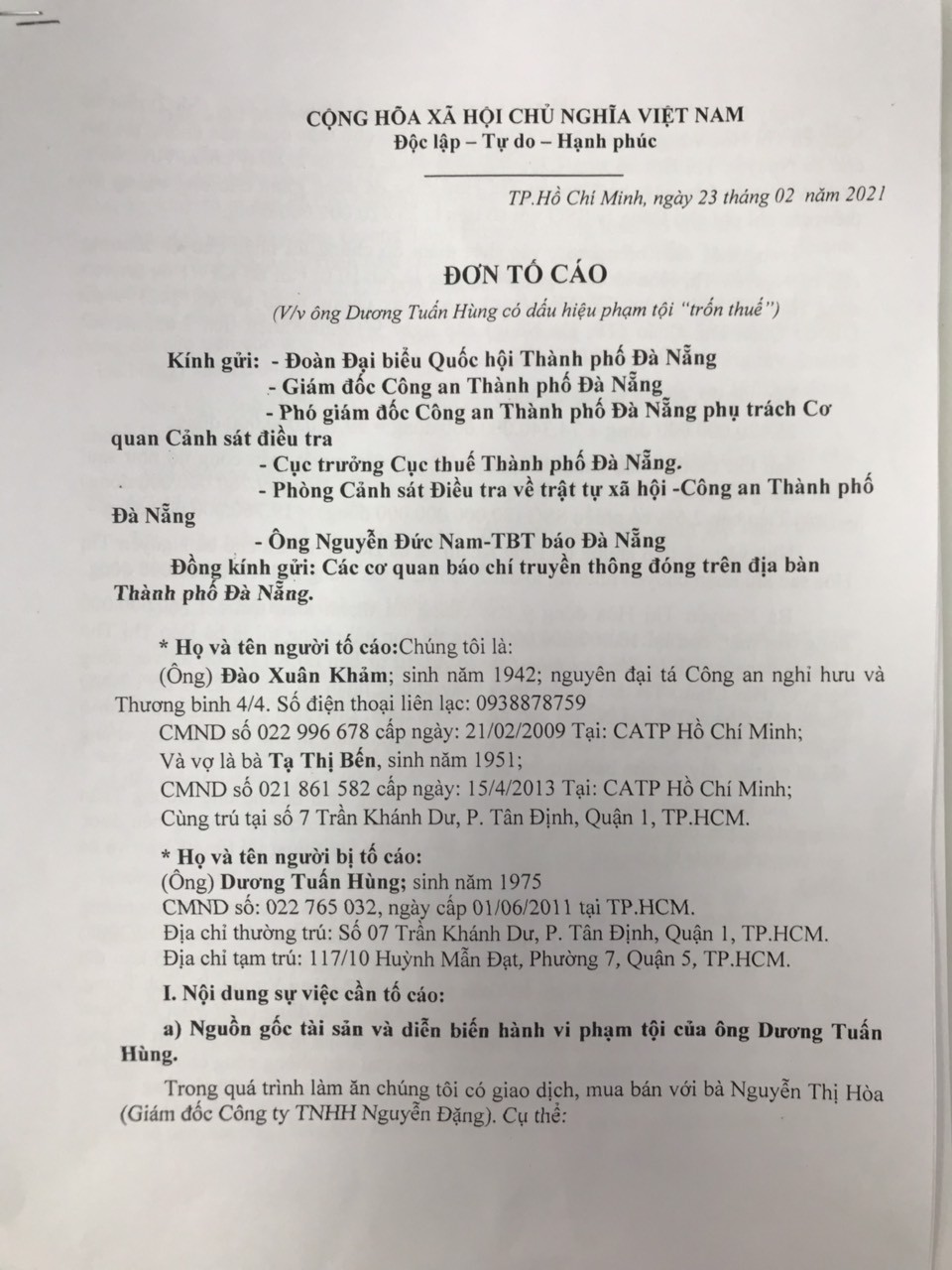 Theo đó, vợ chồng ông Đào Xuân Khảm, trú phường Tân Định, quận 1, TP.HCM vừa có đơn gửi cơ quan Cảnh sát điều tra Công an TP.Đà Nẵng cùng các cơ quan ban ngành khác của địa phương này, tố cáo ông Dương Tuấn Hùng, SN 1975, trú phường 7, quận 5, TP.HCM hành vi trốn thuế.