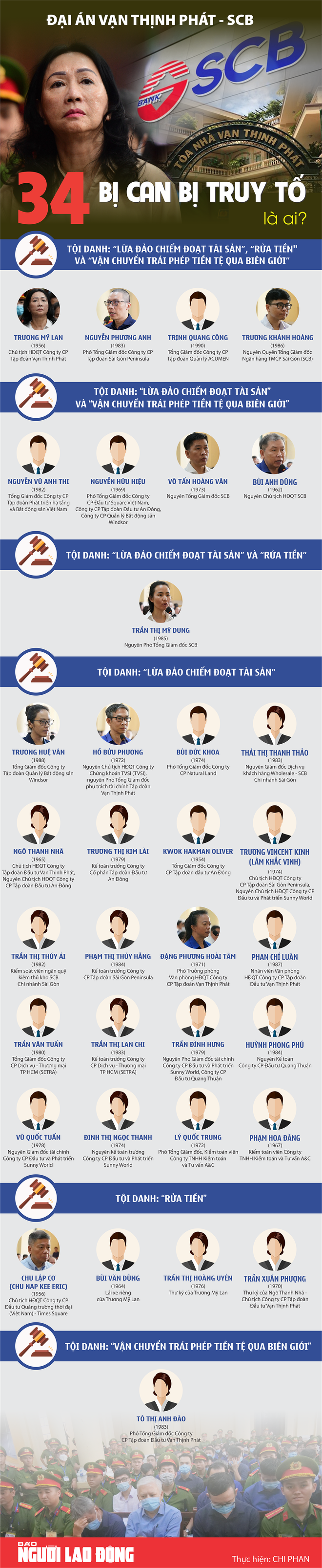 Ở giai đoạn 2 vụ án xảy ra tại Tập đoàn Vạn Thịnh Phát và Ngân hàng TMCP Sài Gòn (SCB), cơ quan điều tra đề nghị truy tố 34 bị can ở 3 nhóm tội: “Lừa đảo chiếm đoạt tài sản”, “Rửa tiền” và “Vận chuyển trái phép tiền tệ qua biên giới”.