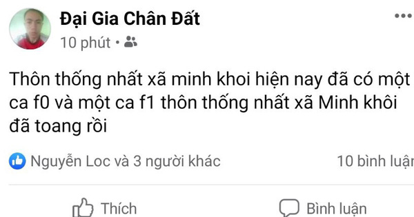 Thông tin trên đã thu hút nhiều người xem và tham gia bình luận khiến nhiều người dân trên địa bàn xã Minh Khôi, huyện Nông Cống hoang mang lo lắng. Tuy nhiên, qua kiểm tra, xác minh đến thời điểm hiện tại trên địa bàn thôn Thống Nhất, xã Minh Khôi chưa có ca F0 nào. Thông tin mà tài khoản Facebook "Đại gia chân đất" đăng tải là không đúng sự thật.