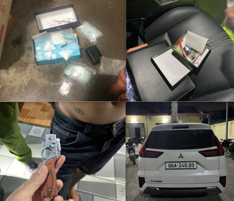 Tiến hành kiểm tra trên người và xung quanh khu vực chòi rẫy, lực lượng Công an phát hiện một bịch ma túy đá, một con dao bấm trong túi quần của đối tượng và một bộ dụng cụ để sử dụng ma túy.