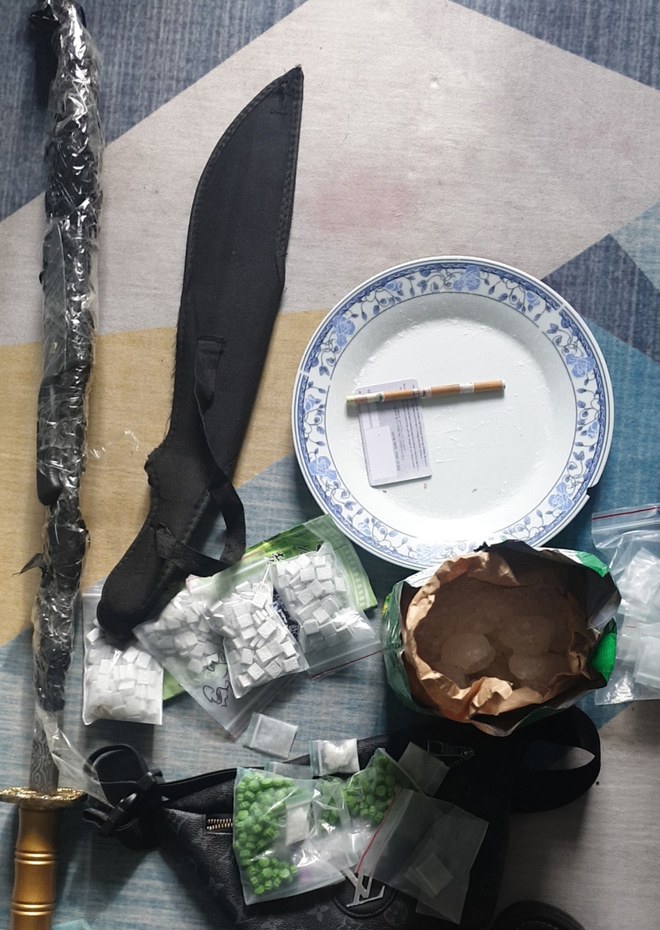 Tại đây, công an phát hiện Đỗ Văn Kiên, Nguyễn Minh Cường (SN 1997, ngụ tỉnh Đồng Tháp) cùng 5 người ở trong chung cư và thu giữ nhiều ma tuý, hung khí…
