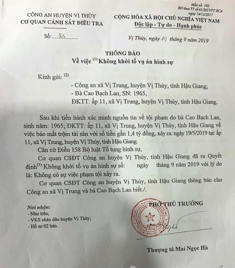 Sau 4 tháng tích cực điều tra, xác minh, cuối cùng ngày 19/9/2019, Thượng tá Mai Ngọc Hà, Phó Thủ trưởng cơ quan cảnh sát điều tra công an huyện Vị Thủy đã ký thông báo “không khởi tố vụ án hình sự” về tội trộm cắp tài sản đối với bà Nguyễn Huỳnh Thuận An với lý do “không có sự việc phạm tội xảy ra”.