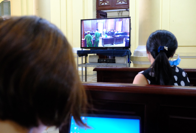 Những người theo dõi phiên tòa được yêu cầu ngồi bên ngoài xem qua màn hình.