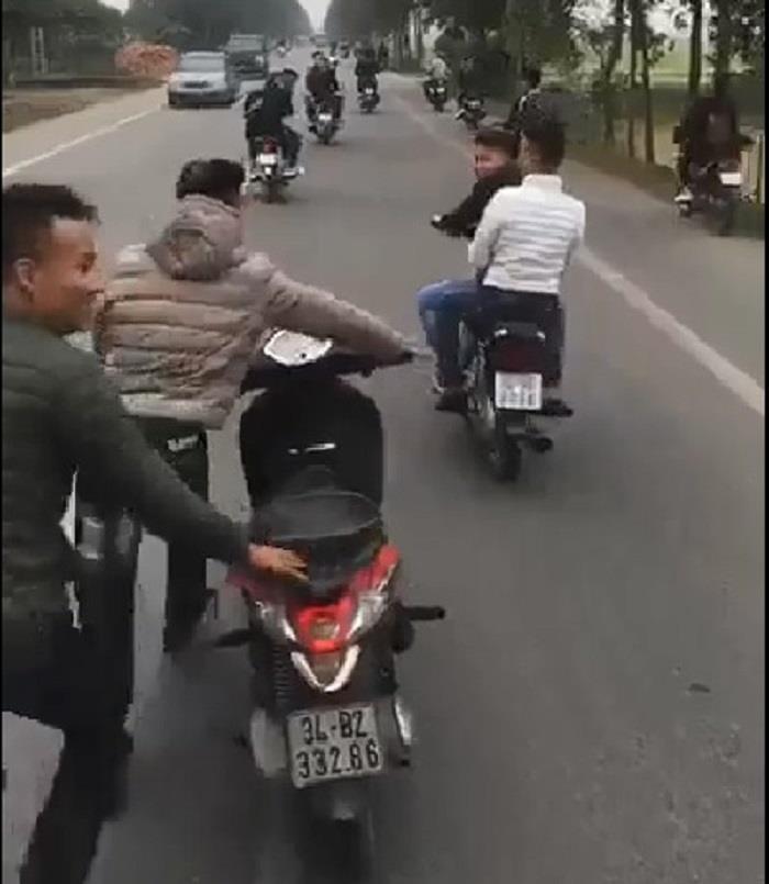Theo nội dung trong clip, nhóm thanh niên dàn hàng ngang, đi tốc độ "rùa bò" chặn đầu xe. Thậm chí, 2 thanh niên trong nhóm chở nhau trên xe máy BKS 34B2-332.86 còn xuống xe, dắt bộ ngay trước đầu ô tô với thái độ cợt nhả.