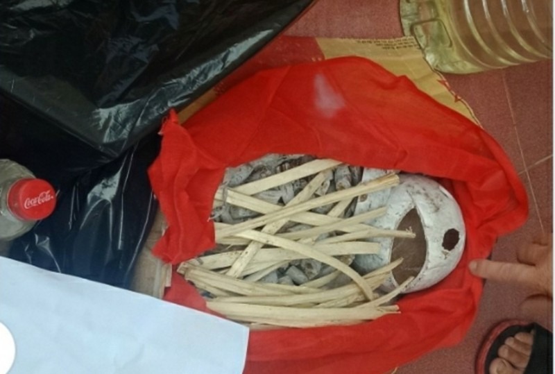Bước đầu xác định ngôi mộ vừa chôn là của nhóm này, trong tiểu sành là hài cốt giả được làm bằng sọ dừa và vật dụng khác.