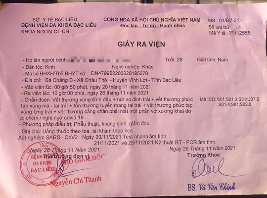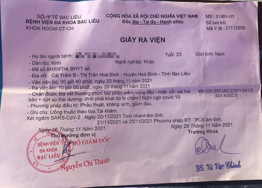 Theo giấy ra viện của Bệnh viện Đa khoa tỉnh Bạc Liêu ngày 26-11-2021, anh H. và anh Đ. bị nhiều vết thương phức tạp trên khắp cơ thể.