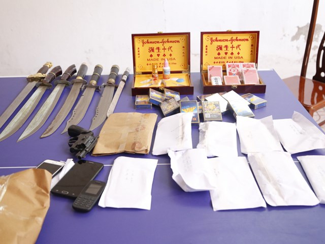 Tại hiện trường, lực lượng Công an thu giữ hơn 252 triệu đồng, 1 khẩu súng, 7 dao kiếm, 5 bộ bài và một số đồ vật, tài liệu có liên quan đến hoạt động đánh bạc.