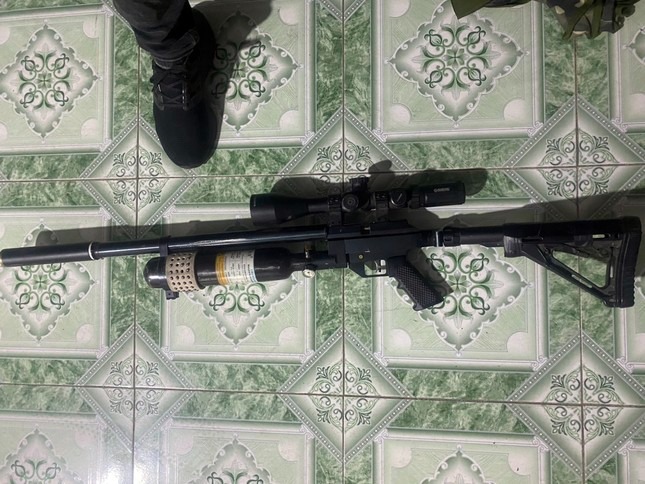 Cảnh sát cũng phát hiện, thu giữ 1 khẩu súng màu đen (dạng súng hơi) dài 1,1m, có ống ngắm và 116 viên đạn chì đường kính 4,5mm.