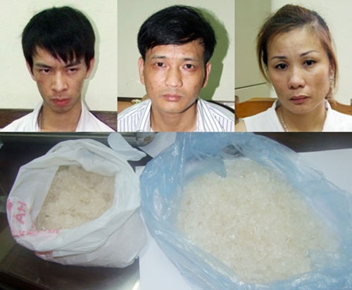 Các đối tượng Tuấn Anh, Hoà, Hường và 1,5kg ma túy đá. Ảnh: Danh Quốc. |