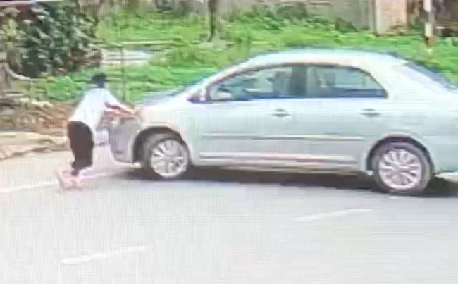 Ngay sau khi phát hiện, em Na vội vàng chạy theo xe ôtô, đứng chặn trước mũi xe hô hoán người dân tới giúp. Khi bị nữ sinh chặn lại, người này vẫn cho xe đi tiếp khiến cô gái ngã ra đường.