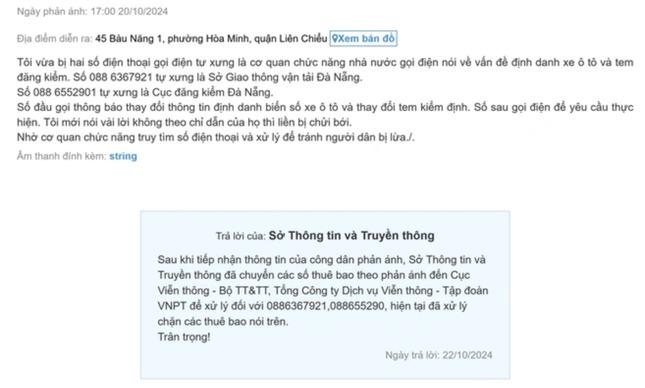 Trước đó, người dân đã phản ánh lên Sở GTVT TP. Đà Nẵng việc bị 2 số điện thoại gọi nói về vấn đề định danh ô tô và tem đăng kiểm.