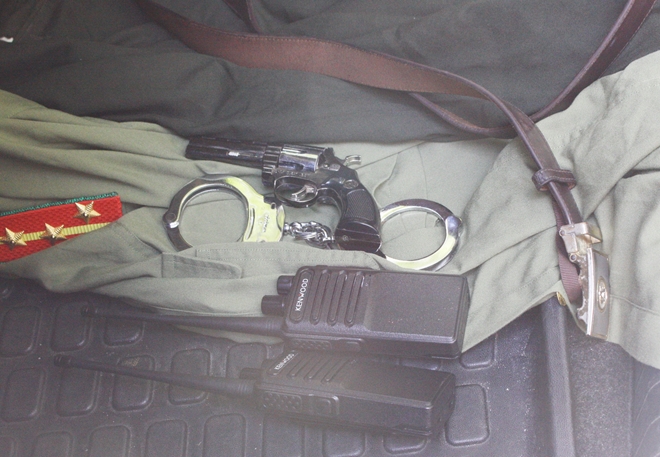 Kiểm tra chiếc ôtô Mazda6, BKS 43A-147.38 mà Quí đang sử dụng, lực lượng Công an phát hiện, thu giữ nhiều trang phục, phương tiện phục vụ trong ngành CAND, bao gồm quân phục Đại úy An ninh nhân dân, còng số 8, bộ đàm, bật lửa hình dạng súng ngắn...