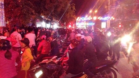 Nhiều người dân tập trung trước căn nhà 4 tầng, được dùng làm cửa hàng điện máy của vợ chồng ông Hà, bà Nhung - Ảnh: Ngọc Minh |