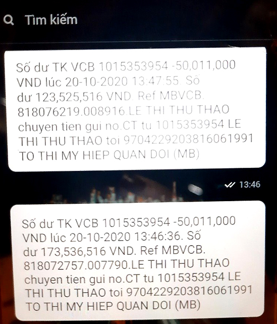 Chị vừa nói chuyện điện thoại với ông ta, vừa lấy điện thoại khác đăng nhập vào đường link. Ngay sau đó, tài khoản của chị 3 lần bị trừ mất 50 triệu đồng. Số điện thoại của gã đàn ông tiếp tục gọi đến nhưng chị không nghe máy. "Do tôi không bắt máy nữa nên 50 triệu đồng bị rút lần thứ 3 được hoàn trả lại tài khoản. Tôi còn mất 100 triệu đồng", chị Thảo cho biết.