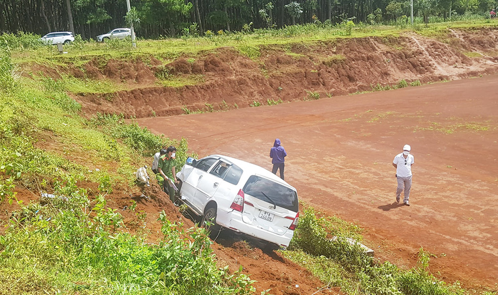 Chưa dừng lại, ông Ngọc tiếp tục điều khiển xe nhiều lần đâm thẳng vào xe của bà Mùi. Chiếc xe ô tô của bà Mùi hư hỏng nặng, rơi thẳng xuống sân bóng nằm bên đường.