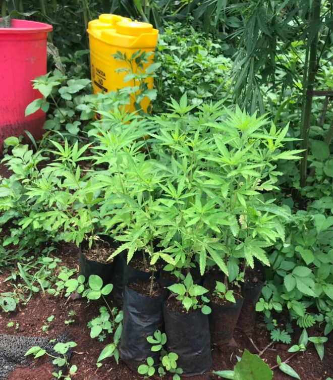 Trong đó, tại đám đất cuối vườn, phát hiện hai điểm đối tượng để cây cần sa trong bầu ươm với 62 cây, chiều cao dao động từ 10-30cm; 99 cây trồng trong vườn (diện tích 180 m2) có chiều cao từ 10-220cm.