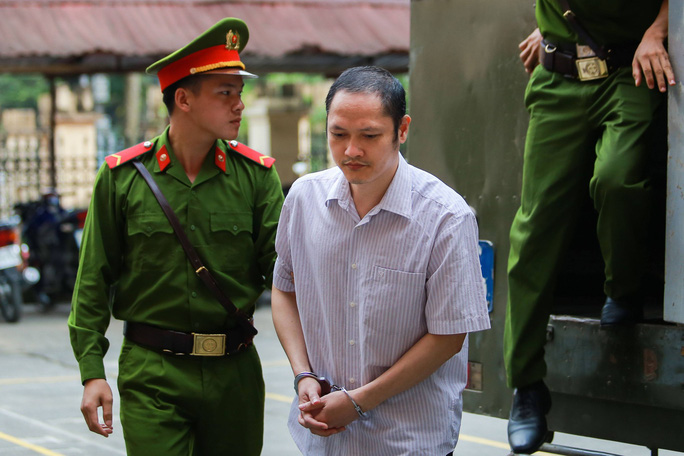 Các bị cáo Nguyễn Thanh Hoài và Vũ Trọng Lương, nguyên trưởng và phó Phòng Khảo thí và Quản lý chất lượng giáo dục, Sở Giáo dục và Đào tạo (GD-ĐT) tỉnh Hà Giang, được công an dẫn giải đến tòa.